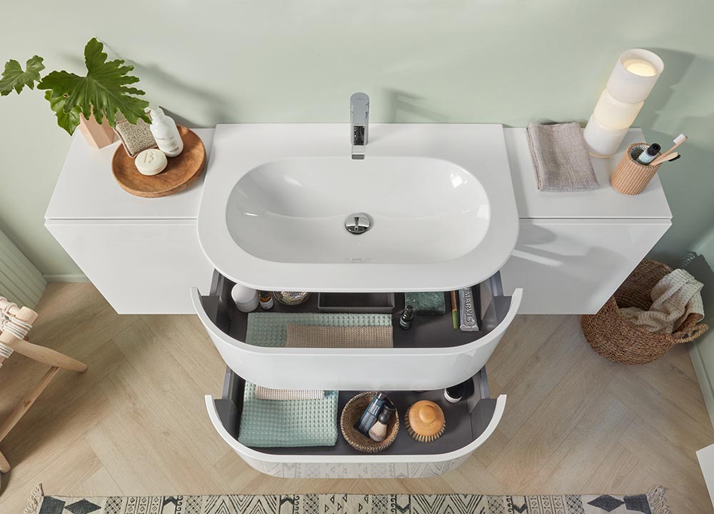 Kernstück der Kollektion ist der Waschplatz, an dem Unterschrank und Waschtisch mit ihren konsequent ovalen Formen eine harmonische Einheit bilden: Die schlichten, wahlweise grifflosen Fronten, unterstreichen das zeitlose und ruhige Erscheinungsbild der Kollektion. Der 80 cm breite Unterschrank bietet mit zwei gleichgroßen, innen in modernem Anthrazit gehaltenen Vollauszügen jede Menge praktischen Stauraum für die täglichen Badutensilien. Dank integriertem Anti-Rutschboden lässt sich alles sicher und ordentlich verstauen.
