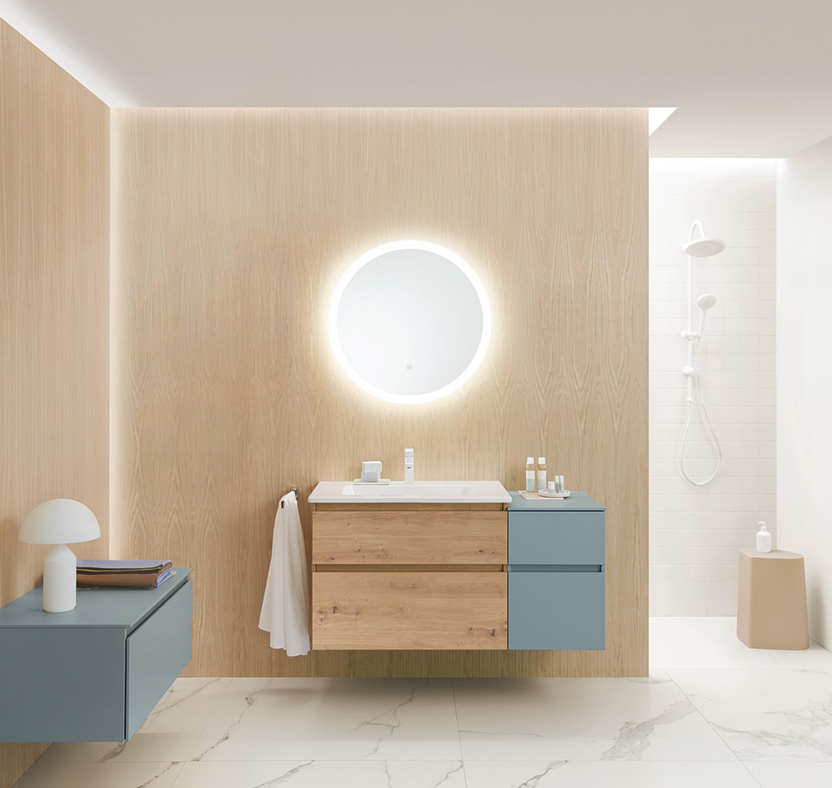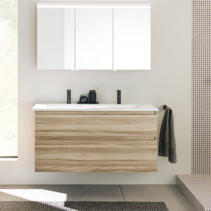Hinter Lin20 steht ein modulares Konzept. Waschtischunterschränke und Anbauschränke fügen sich zu einem harmonischen Gesamtbild zusammen. Die durchgehende Griffleiste betont den geradlinigen und authentischen Charakter der Designlinie. Lin20 stellt zudem ein breites Repertoire an Waschtischen bereit. Im Zusammenspiel mit dem schlichten Design der Unterschränke wirkt jeder Waschplatz feinsinnig und ausgewogen.