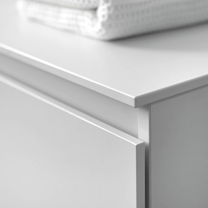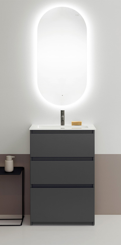 Stimmungsvolles Licht, viel Stauraum und wunderschöne Waschplätze. Die grifflosen Möbel von Lin20 lassen sich auf vielfältige Weise zu eindrucksvollen „Badzeilen“ kombinieren, auch mit wechselnden Oberflächen. Andererseits beweist die Designlinie auch auf kleiner Fläche wahre innere Größe, wie z.B. mit einem bodenstehenden Waschtischunterschrank für einen Keramikwaschtisch, der nur 370 mm tief ist.